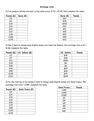 A collection of English ESL worksheets for home learning online practice distance learning and English classes to teach about currency currency. A woman exchanges 450 into euros. Currençy Exchanae Use the exchange rates from the following table.